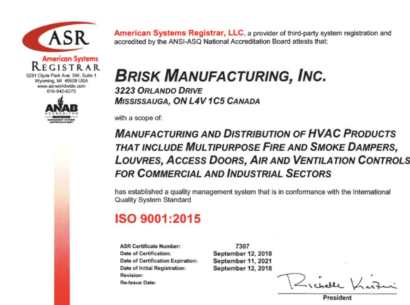 BRISK Mfg Inc. manufactures and distributes high quality HVAC products in two market categories - Air Movement Control and Air Distribution. We are located in a 20,000 square foot building in Mississauga, close to major highways and transportation corridors. The company distributes its products throughout North America, as well as Europe and the Middle East. Established in 2003, BRISK Mfg Inc is one of the most prominent customized batch production facilities in Canada. The company's unique combination of high speed roll formers, CNC sheet metal, laser cutting, turning, milling and stamping along with complete welding, fabrication and assembly services makes it possible to provide the most cost effective manufacturing solutions possible. BRISK Mfg Inc is quality oriented organization and is certified for ISO 9001:2008 International Standard. Our products which are installed in commercial, industrial and institutional buildings, are the number one choice for the trades based on quality, delivery and price. We are proud to note that many mechanical consulting engineers specify our products in the design of complete mechanical systems for new construction. BRISK Mfg Inc continues to increase its product line for the international market Through recently developed joint venture partnerships with several US manufacturers BRISK Mfg Inc has positioned itself as a preferred choice for mechanical consulting engineers worldwide. All our products meet or exceed national and international safety standards, such as UL 555, AMCA and CSA.